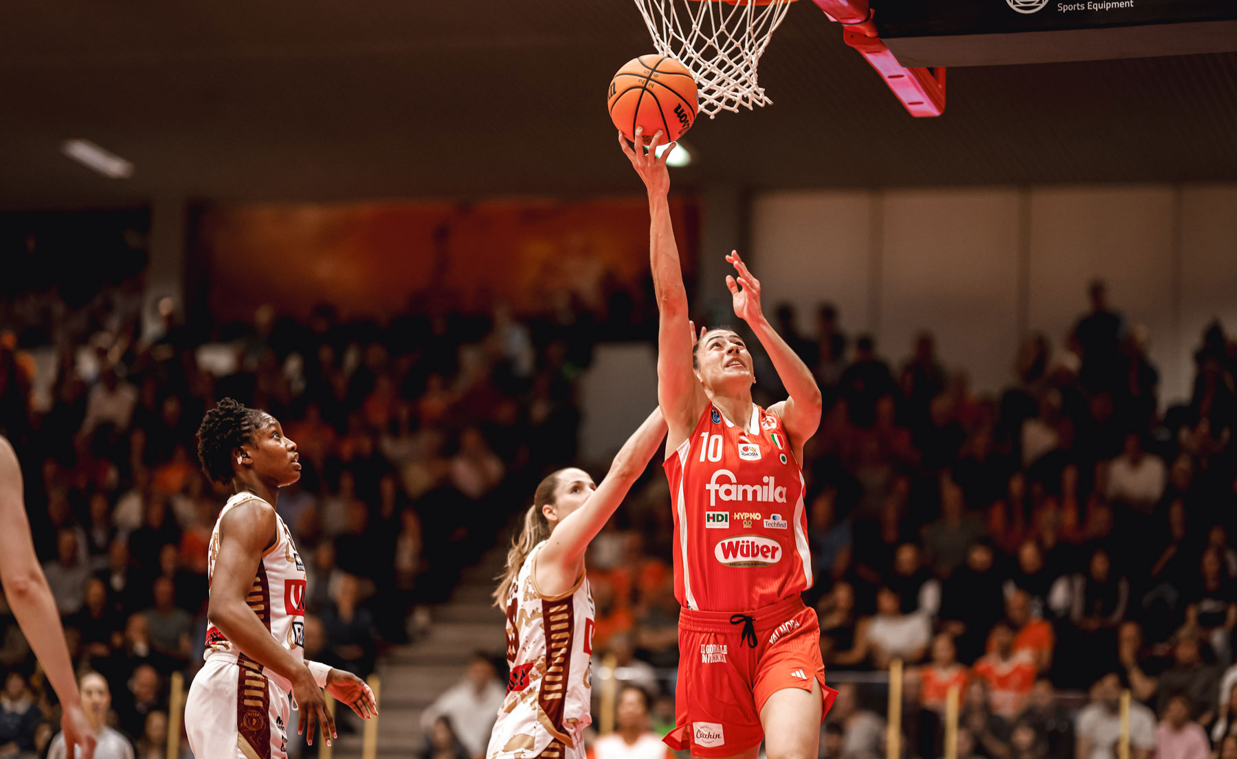 Non cambia il copione perché il Famila Wuber, dopo i 4 punti iniziali di Badiane e Verona – annullati da Villa – continua a sparare a salve da ogni zona del campo e Santucci in contropiede firma il primo vantaggio in doppia cifra: 51-61 che diventa poco dopo 51-64. Shepard e Sottana provano a suonare la carica ma la difesa a zona di coach Dikaioulakos viene battuta a ripetizione dalle triple di Pan: 57-70 a due dalla fine. Purtroppo nell’ultimo minuto c’è da segnalare l’infortunio alla caviglia di Pan proprio poco prima della sirena finale che sancisce il successo delle ospiti per 60-71.